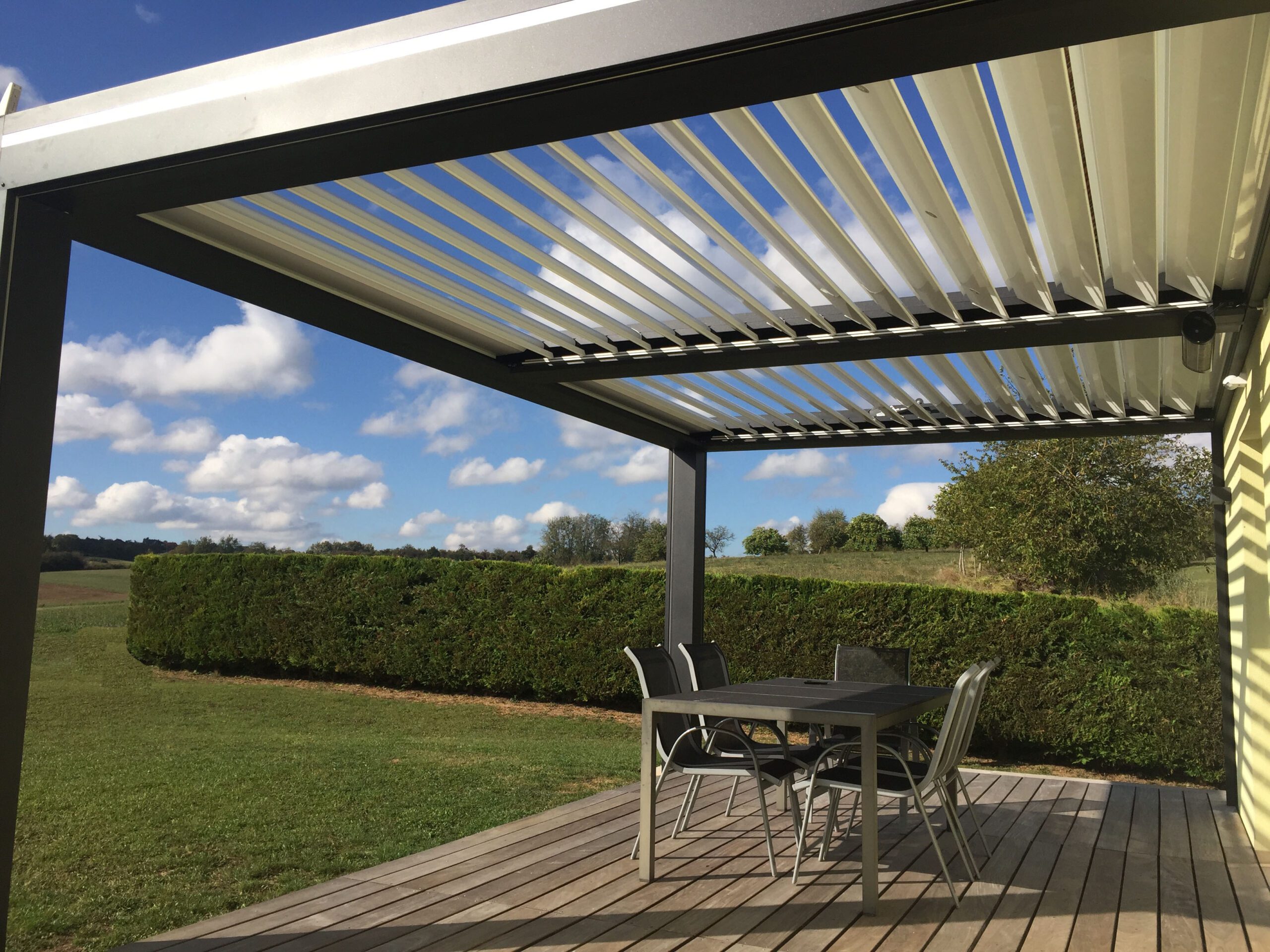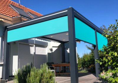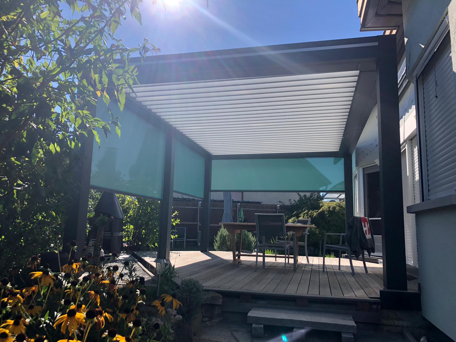 Le concept de pergola bioclimatique vous permet de vous protéger du soleil et de la pluie en toute saison. Le système de gestion climatique apporte une facilité d’utilisation supplémentaire. En cas d’averse, les lames se referment automatiquement, puis s’ouvrent avec le retour du soleil.